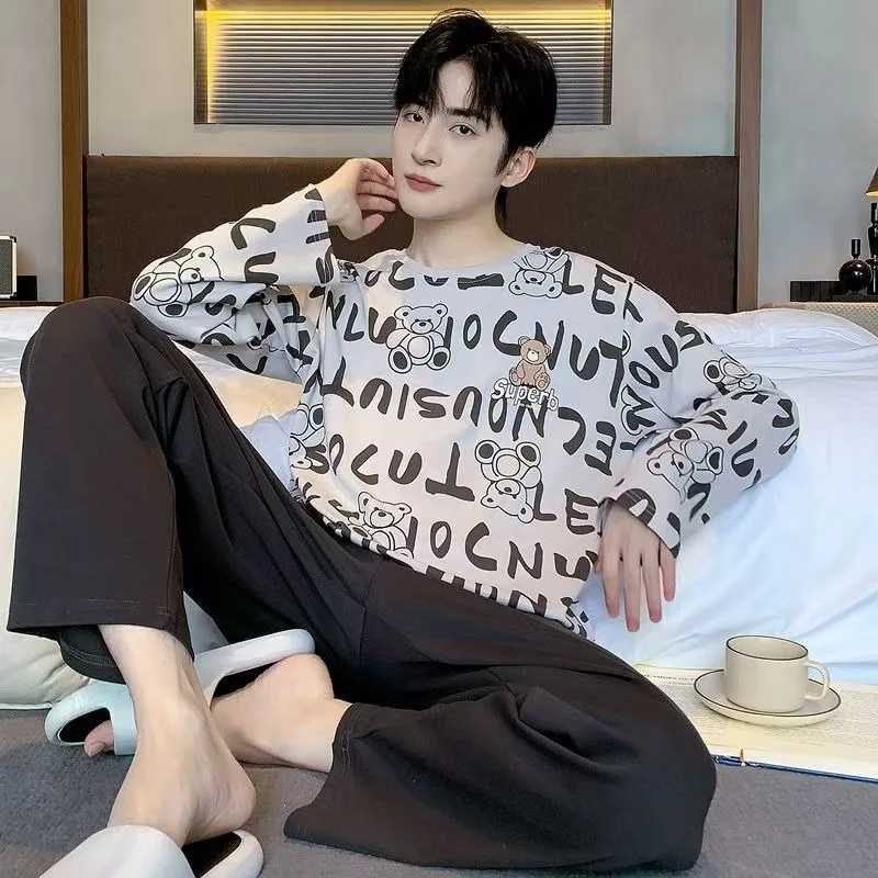 ฤดูใบไม้ร่วงและฤดูหนาวขนาดบวกชุดนอนผู้ชายชุดการ์ตูนตัวอักษรเสื้อแขนยาวหลวมลายสก๊อตสีดำลายชุดนอนชุดอยู่บ้าน - TopDealBox
