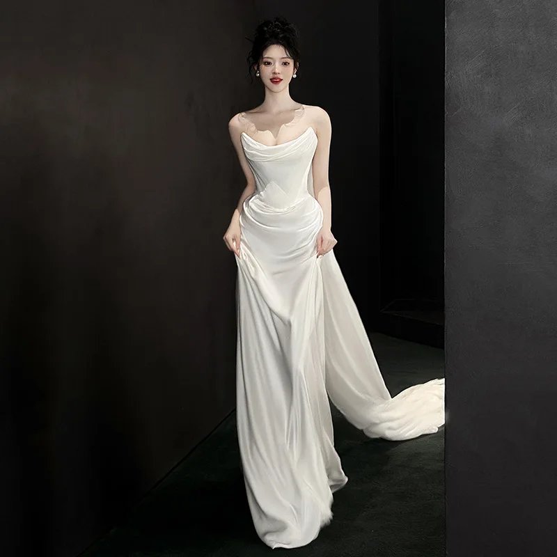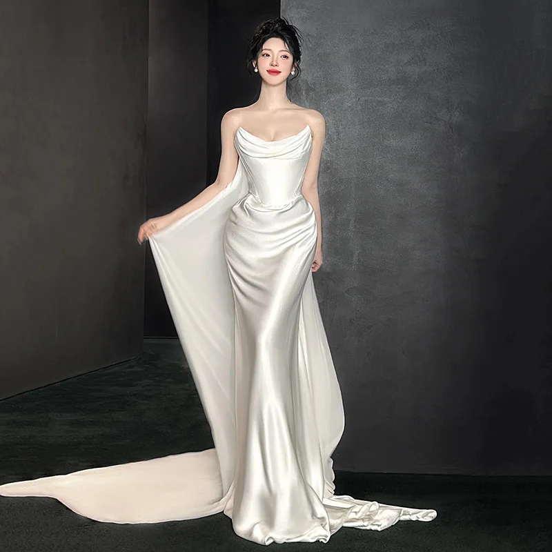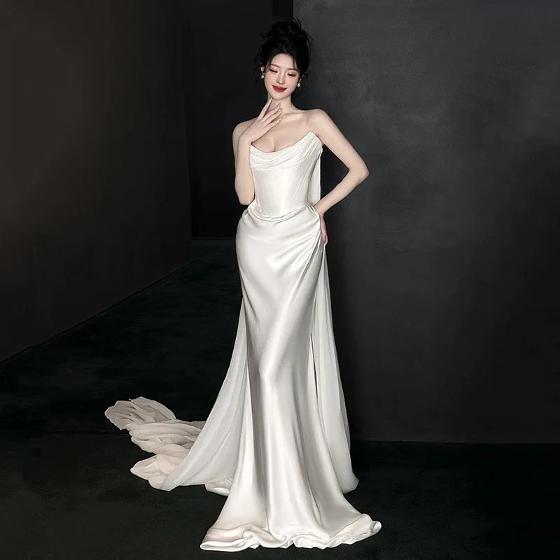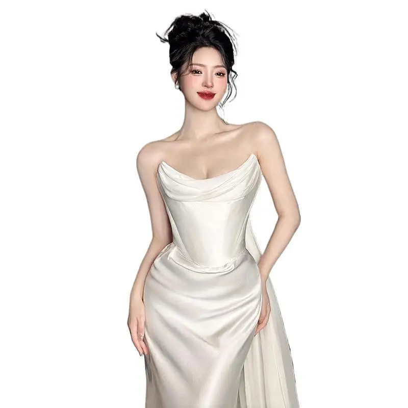 ชุดแต่งงานผ้าซาตินสไตล์ฝรั่งเศส เรียบง่ายและหรูหรา ยินดีต้อนรับและออกไปกับชุดเดรสเกาะอกสีขาว - TopDealBox