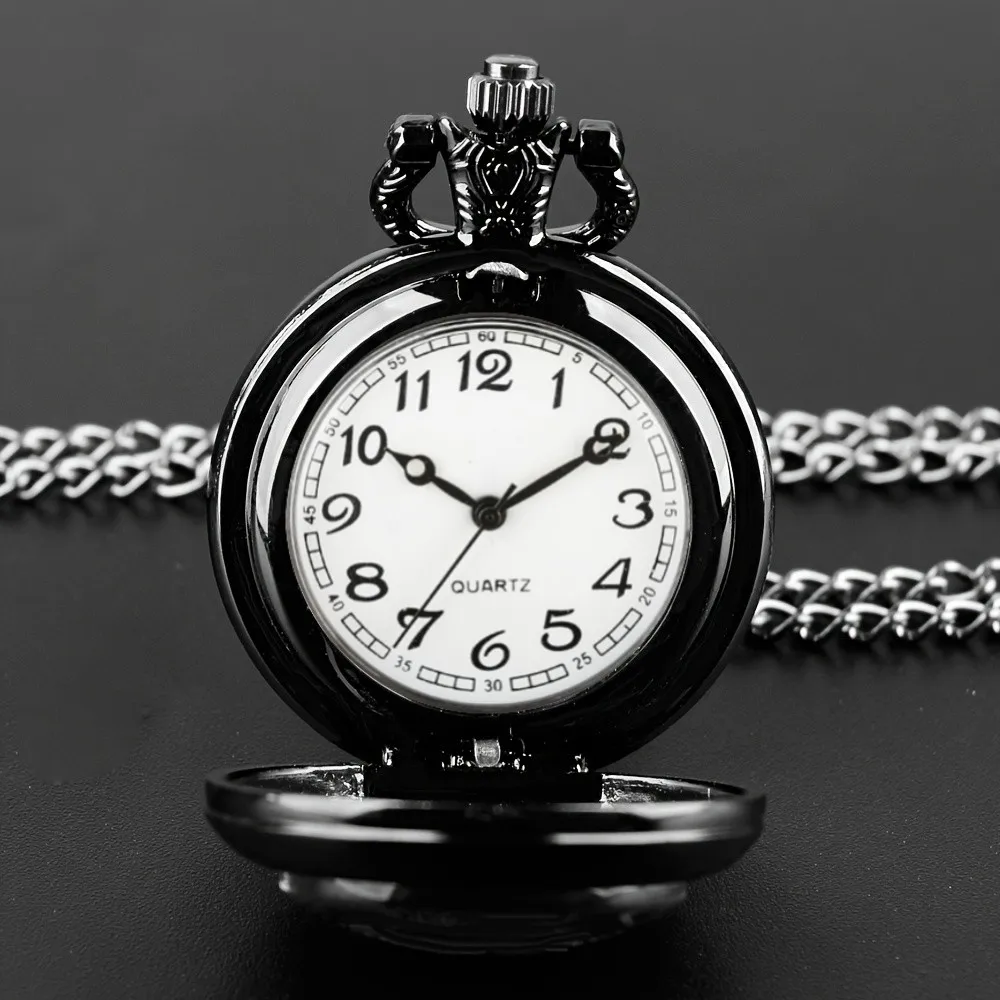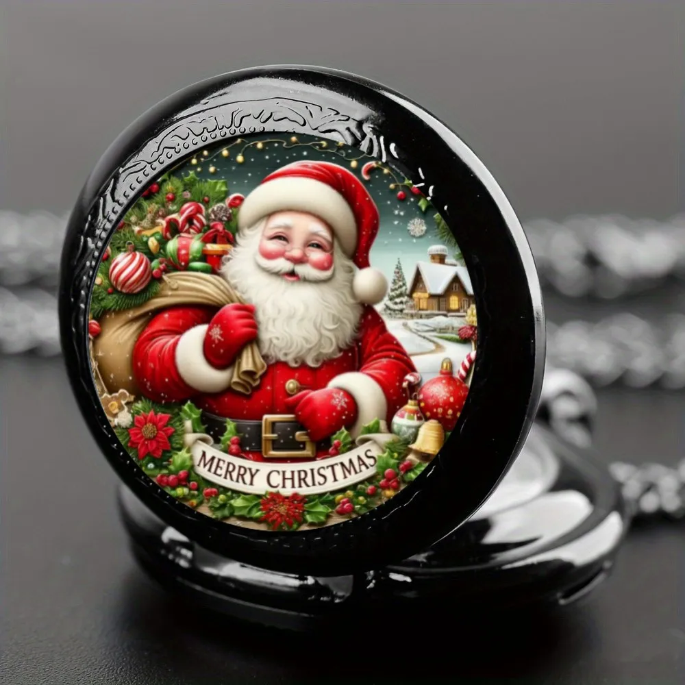 นาฬิกาพกพาควอตซ์ดีไซน์ซานตาคลอสทรงกลมสีดำขนาดมินิสุดหรูหรา ตัวเรือนและสายนาฬิกาทำจากโลหะผสม ของขวัญคริสต์มาสที่สมบูรณ์แบบสำหรับเด็กและผู้ชาย