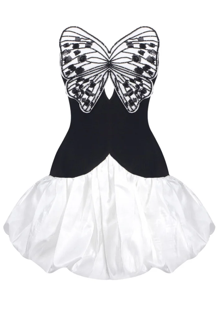 เดรสสั้นเกาะอกสีขาวดำประดับลายผีเสื้อ กระโปรงทรงพองเอวสูง ชุดราตรี แฟชั่นแนวหน้า ชุดสั่งตัด - TopDealBox
