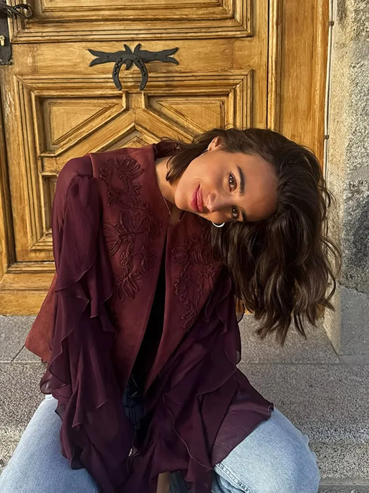 ♡ดูแบบย่อผู้หญิงเย็บลูกไม้เสื้อหลวมเย็บ V คอยาวแขนยาวเสื้อชีฟองฤดูใบไม้ร่วง TOP Elegant Street เสื้อ161.77 THBมาแรง★★★★★★4.9