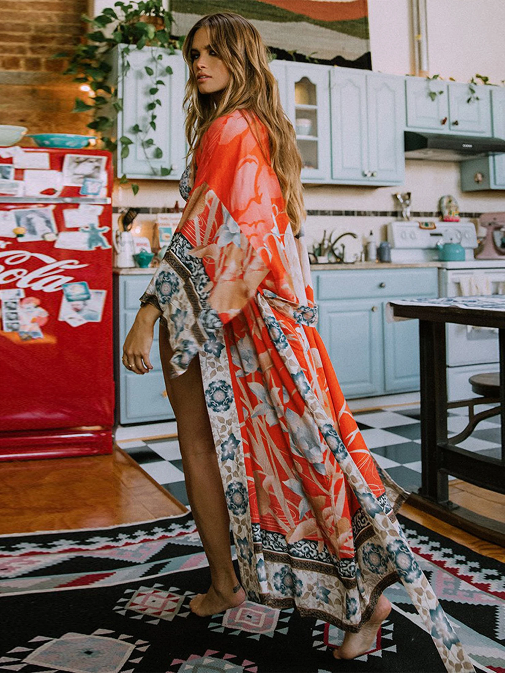 2025 Blue Retroพิมพ์แขนยาวSelf Belted PlusขนาดBohemian Kimono Tunicผู้หญิงเสื้อและเสื้อเสื้อQ1228 - TopDealBox