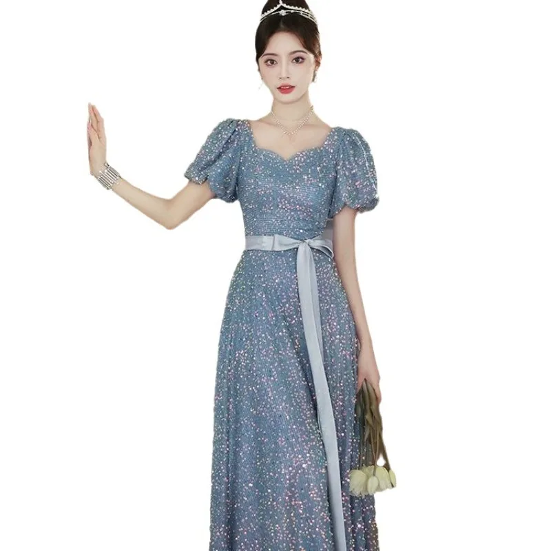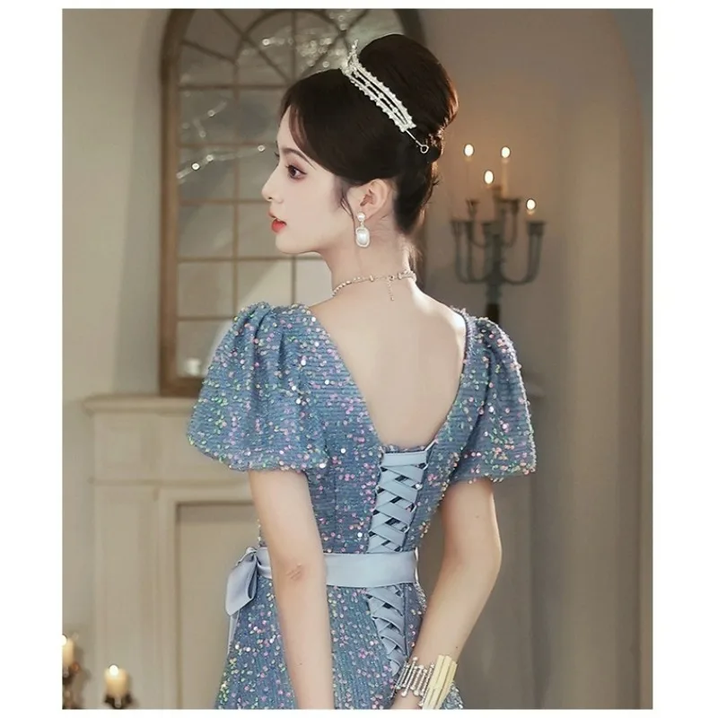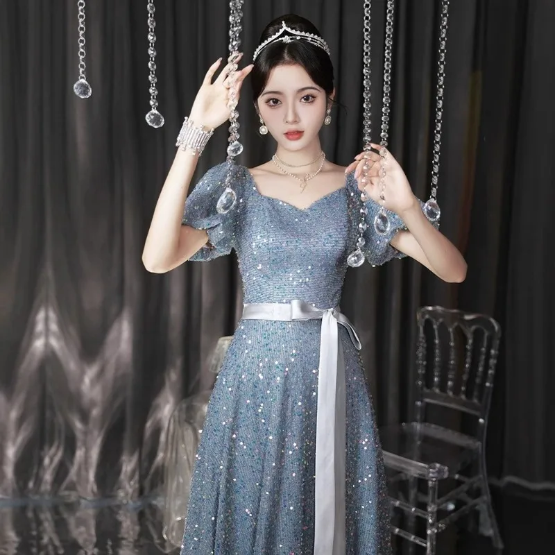 ชุดราตรีคอวีสีน้ำเงินประดับเลื่อมสำหรับผู้หญิงปี 2026 แฟชั่นทันสมัย ช่วยให้ดูผอมเพรียว เหมาะสำหรับงานสอบศิลปะ สายรัดหลัง ชุดสำหรับงานเลี้ยง - TopDealBox