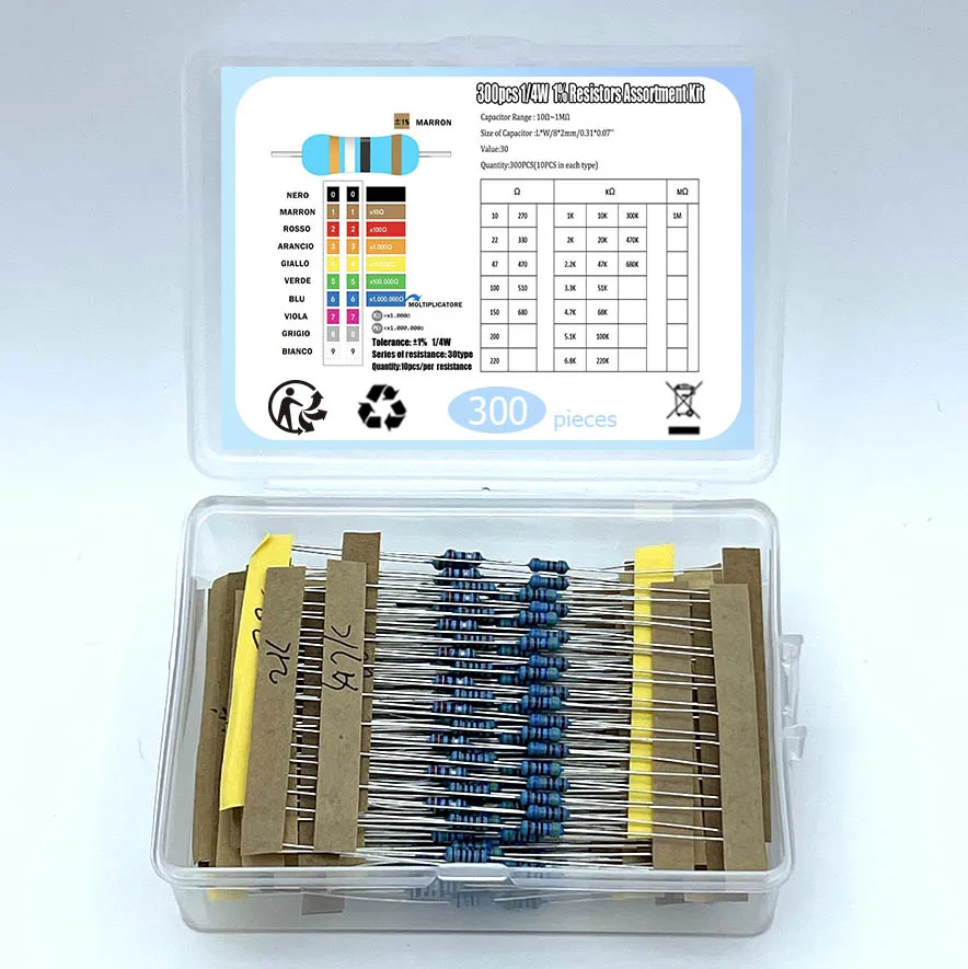 300/600 ชิ้น 1/4 วัตต์ตัวต้านทานฟิล์มโลหะ 30 ค่าความต้านทานชุด 10R-1M 0.25 วัตต์ 1% ตัวต้านทาน