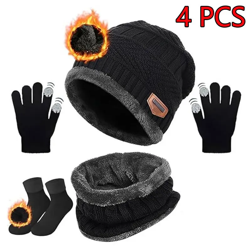 ชุดหมวก ผ้าพันคอ ถุงมือ และถุงเท้าเด็ก 4 ชิ้น สำหรับฤดูหนาว บุขนแกะอุ่น ถักนิตติ้ง หมวกบีนนี่หนา พร้อมที่ปิดหู ขายส่ง