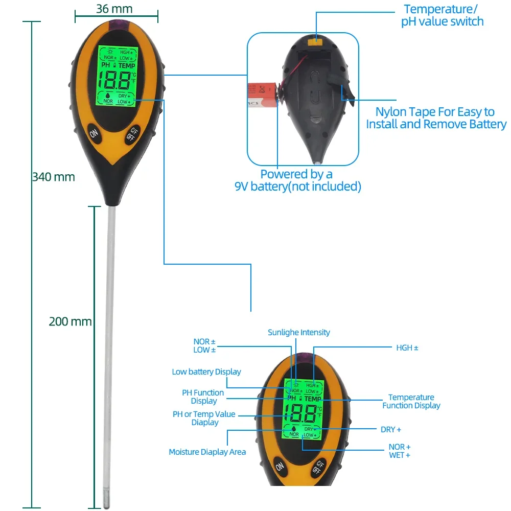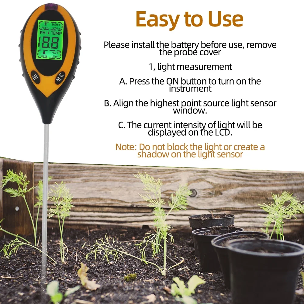 4 in 1 เครื่องทดสอบดิน PH ความชื้นอุณหภูมิดอกไม้เมตรความชื้นในดิน Monitor เครื่องมือวัดความเป็นกรดสําหรับพืชสวน