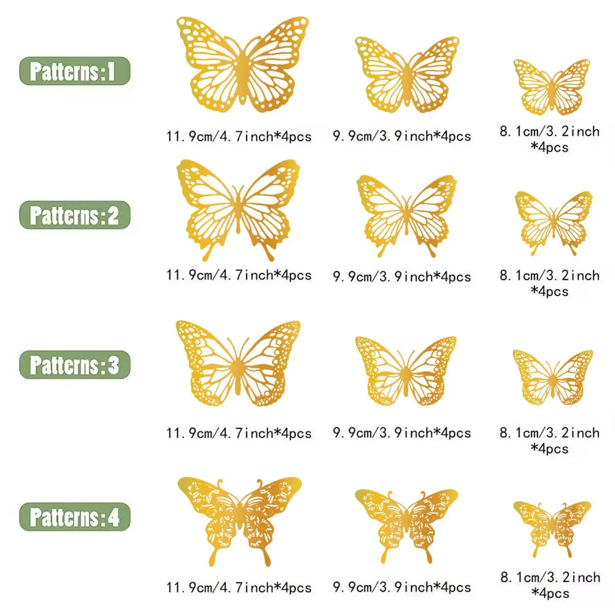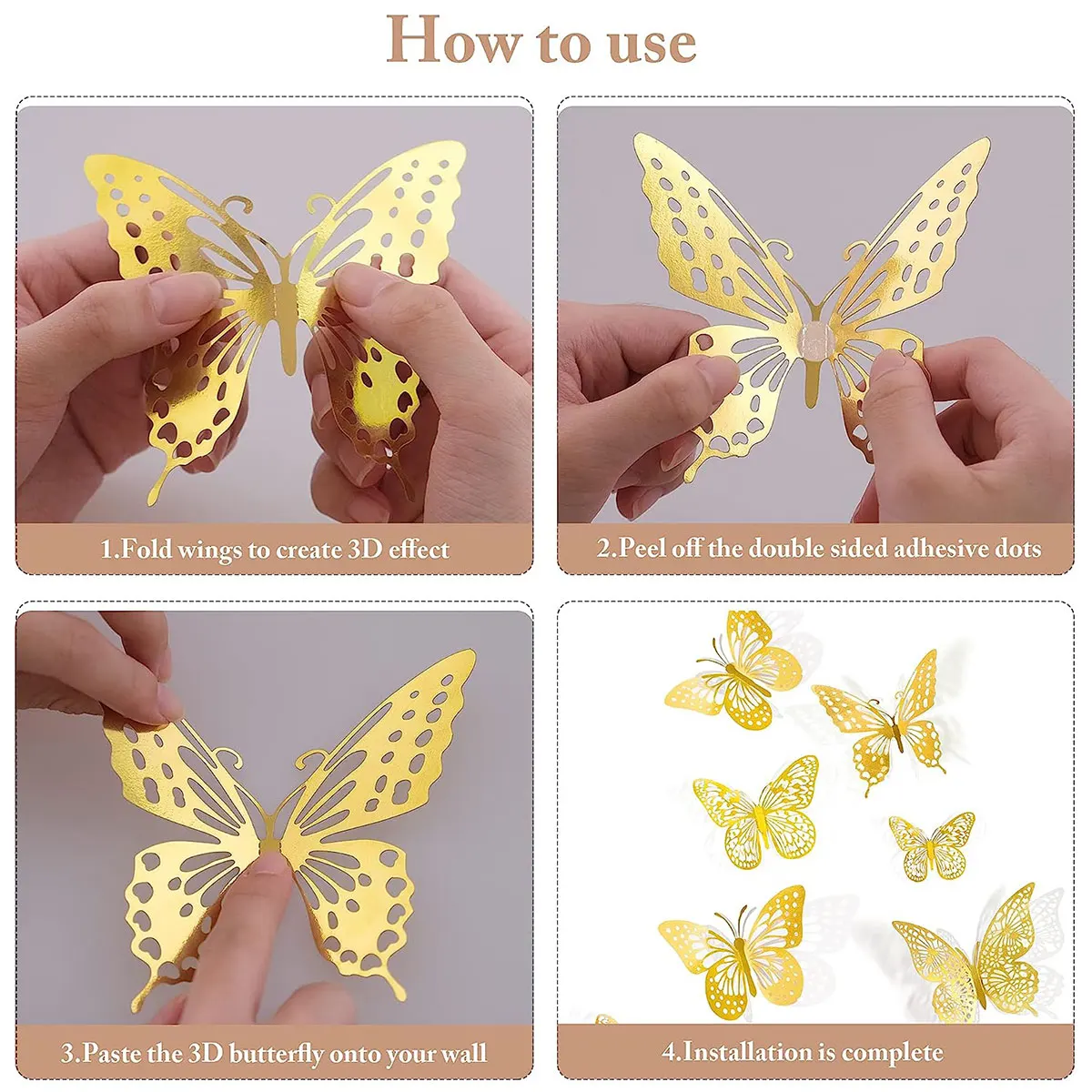 เครื่องตกแต่งฝาผนังผีเสื้อ3D 48ชิ้นมี4แบบ3ขนาดของตกแต่งรูปผีเสื้อสีทองสำหรับงานปาร์ตี้เค้กวันเกิดผีเสื้อของตกแต่งห้อง - TopDealBox