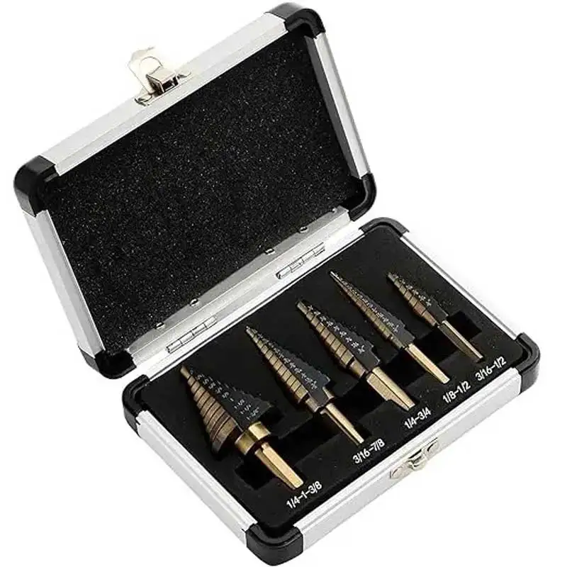 5 ชิ้นบันไดเจาะนิ้วคั่วสีเหลือง Nitriding เจาะสามเหลี่ยม Shank ตรง Groove เจดีย์เจาะขั้นตอนเจาะบิตกล่องอลูมิเนียม - TopDealBox