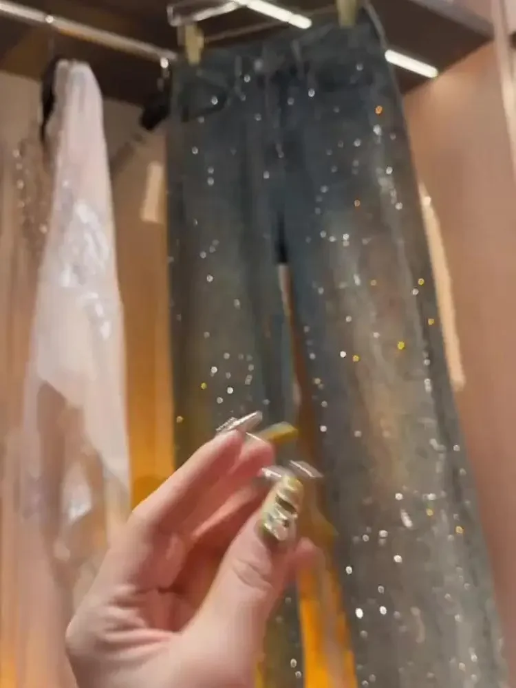 ผู้หญิงเพชรกางเกงยีนส์เงาสูงเอวหลวมขากว้างกางเกง Blue Rhinestone Mopping กางเกง Streetwear กางเกงแฟชั่น