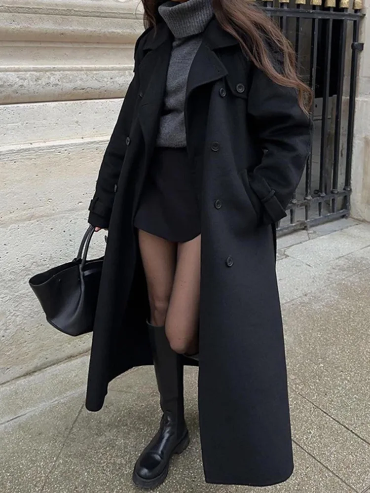Elegantกับเข็มขัดสีดํายาวสําหรับผู้หญิงOversizeขนสัตว์คู่Lapel Overcoatฤดูใบไม้ร่วงใหม่Lady High Street Jacket - TopDealBox