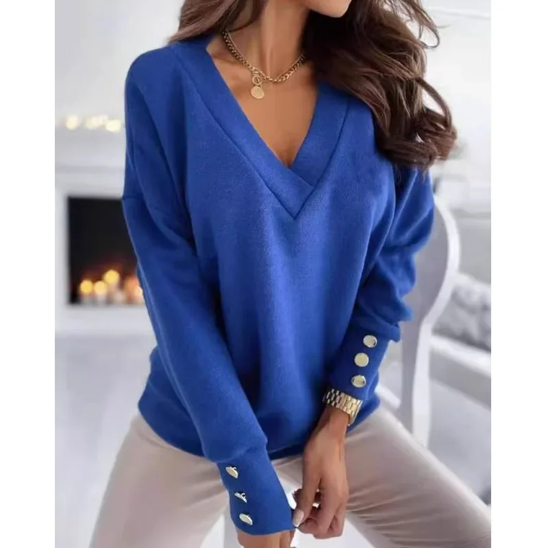 ใหม่เสื้อสำนักงานผู้หญิงเสื้อคอวีลำลองทรงหลวมผ้าคอตตอนแบบ12827 - TopDealBox