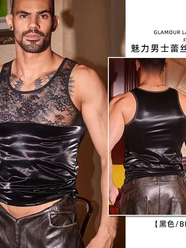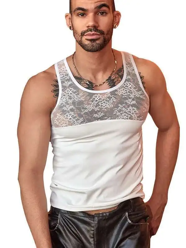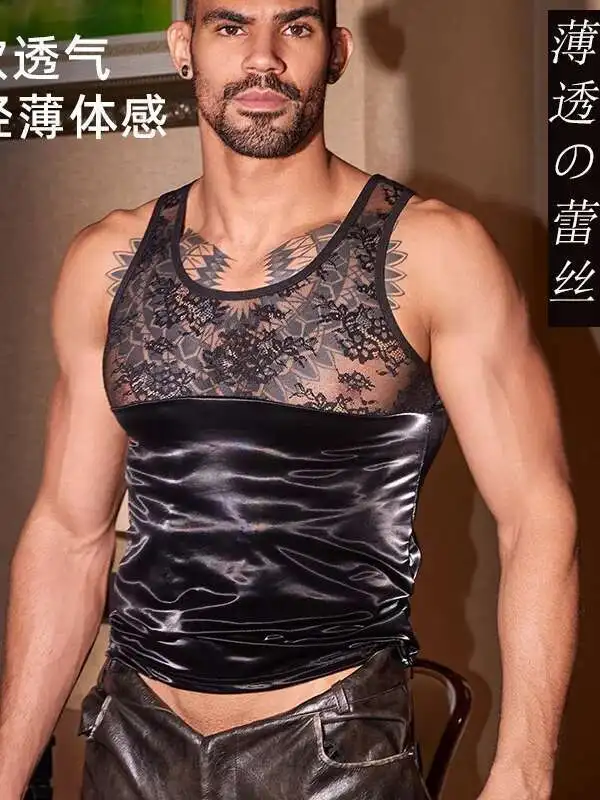 ผู้ชายใหม่เซ็กซี่สีดําสิทธิบัตรลูกไม้ Patchwork ดอกไม้เย็บปักถักร้อยบางโปร่งใสตาข่ายเย้ายวนชายเสื้อกั๊กสําหรับไนท์คลับ 8OCC - TopDealBox