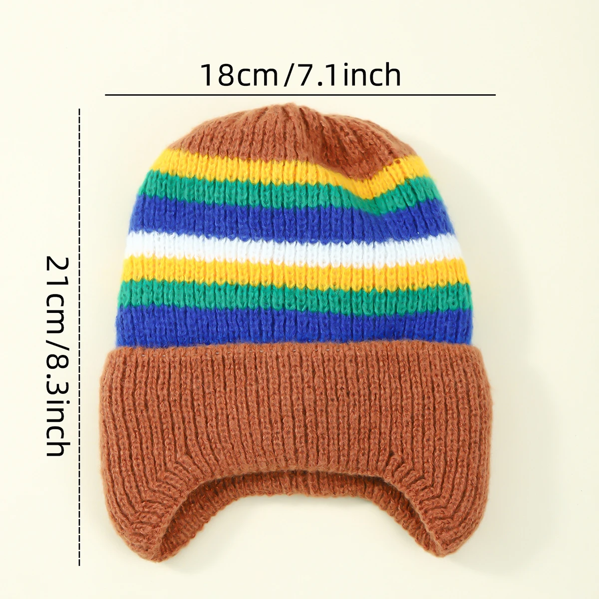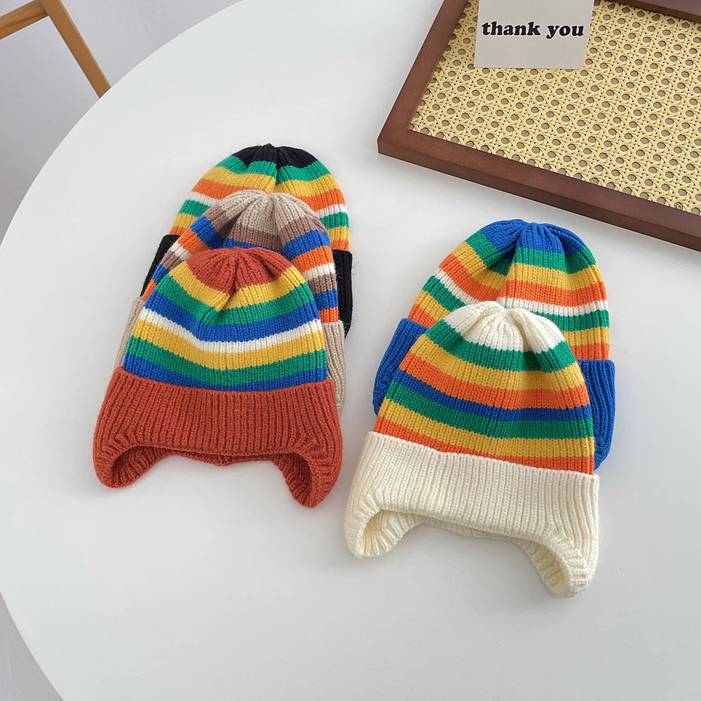ฤดูหนาวเด็กถักหมวกเกาหลีลาย Rainbow Beanie หมวกสําหรับเด็กวัยหัดเดิน Boys Girls เด็กที่มีสีสัน WARM หมวกป้องกันหู Bonnet - TopDealBox
