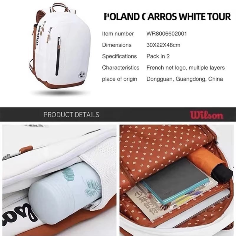 Wilson กระเป๋าเทนนิสถือ 2 ไม้เทนนิสกระเป๋าเป้สะพายหลังภาษาฝรั่งเศสคําเปิดไหล่กระเป๋า Court กระเป๋าแร็กเก็ตผู้ชายผู้หญิงพาเดลกีฬากระเป๋าเป้สะพายหลัง